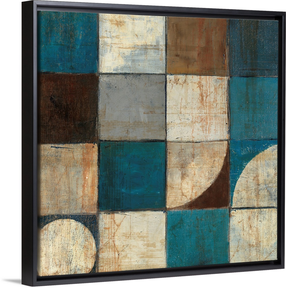 <p>Abstract painting of geometric shapes, with a couple of organic shapes all in warm and cool colors.</p>