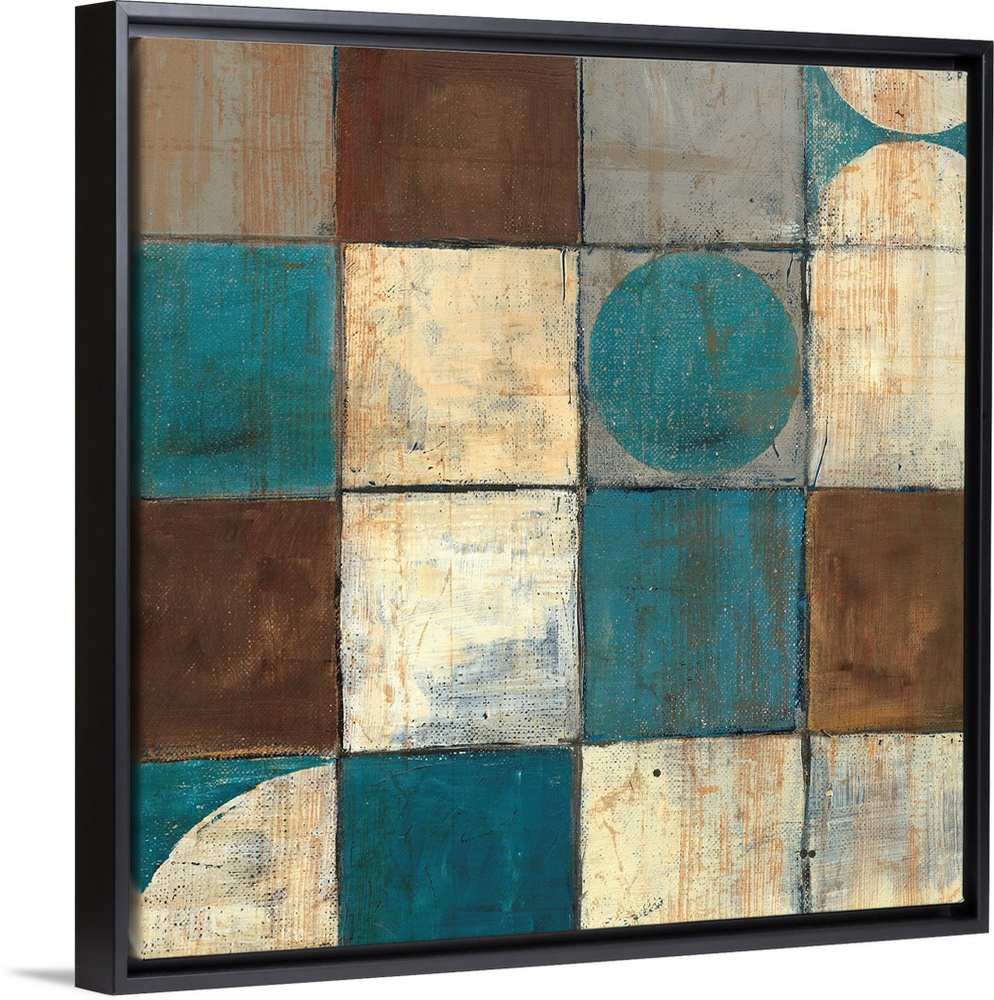 <p>Abstract painting of geometric shapes, with a couple of organic shapes all in warm and cool colors.</p>