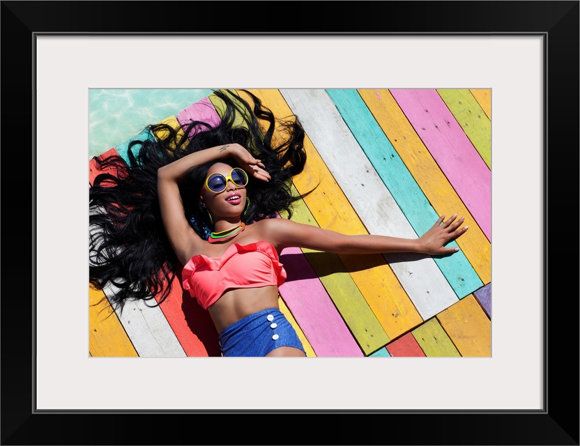 <p>Tropical summer holiday fashion concept - tanning woman on a wooden pier.</p>