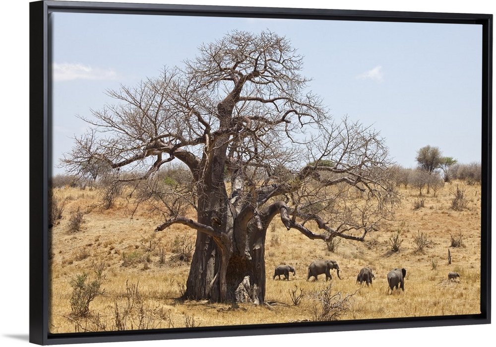 <p>Tanzania, Tarangire. A herd of elephants walks past a massive baobab. Both are what makes Tarangire famous.</p>