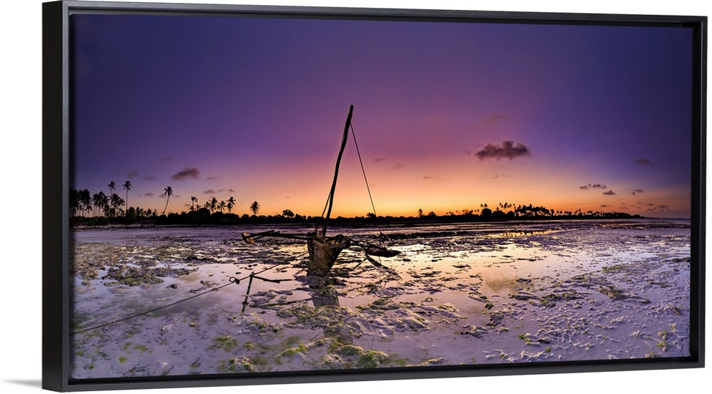 <p>Tanzania. Zanzibar, Jambiani Beach, Dhow (traditional imbarcation) exposed at low tide</p>