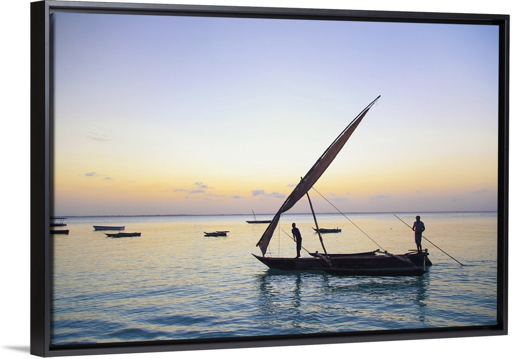 <p>Tanzania. Zanzibar, Michamvi Village, Dhows (traditional sailboats) sailing at sunset</p>