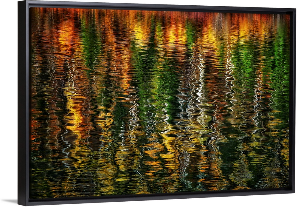 <p>Reflection on a lake of trees on a mountainside, in Autumn, on a breezy afternoon in October. The wiggly white lines are from birches, the golds from larches and grasses, the greens from firs. Made in British Columbia, Canada.</p>