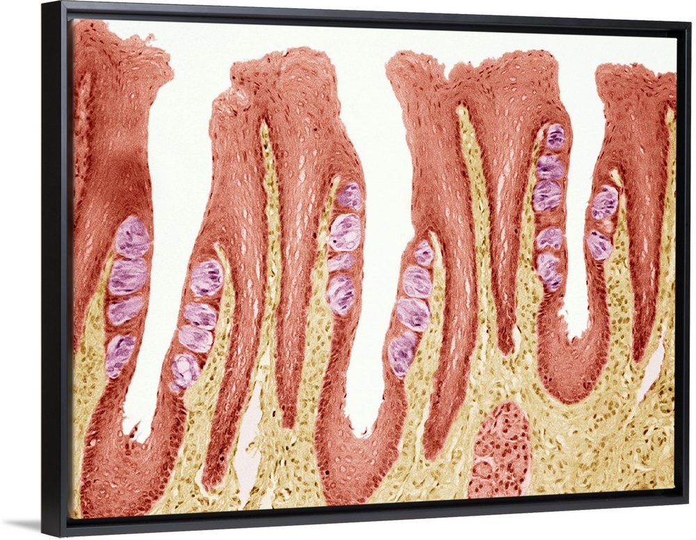 <p>Taste buds. Coloured light micrograph of a section through the tongue, showing taste buds (round, pink). The taste buds are within papillae (projections) located on the surface of the tongue. Taste buds are mostly found on the tongue but are also scattered on the palate, pharynx and epiglottis. They are situated in an epithelial layer (red) and have a taste pore that is exposed to the food meeting the tongue. The five types of taste are: sweet, bitter, acid, salt and umami. Each taste is recognised on a different region of the tongue, the taste buds all have the same structure. Magnification: x65 when printed at 10 centimetres across.</p>