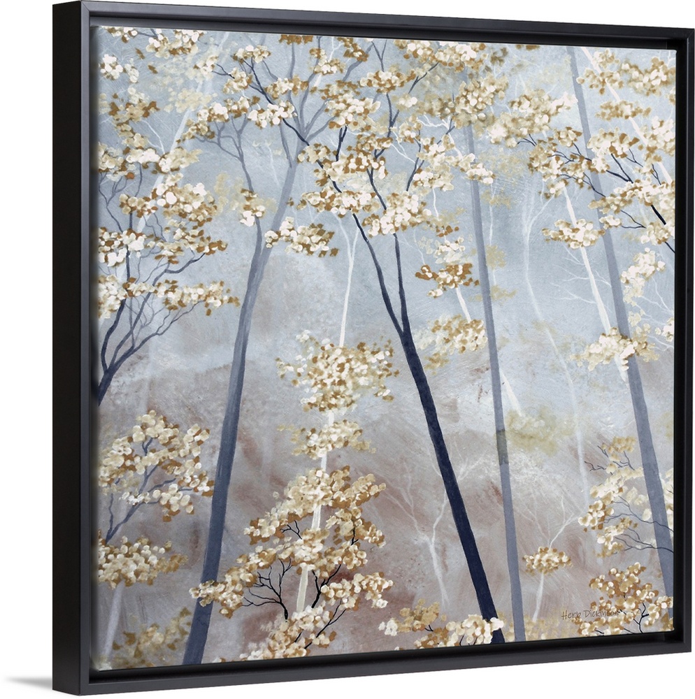 <p>Square painting of tree tops with taupe and white blossoms on a gray background.</p>