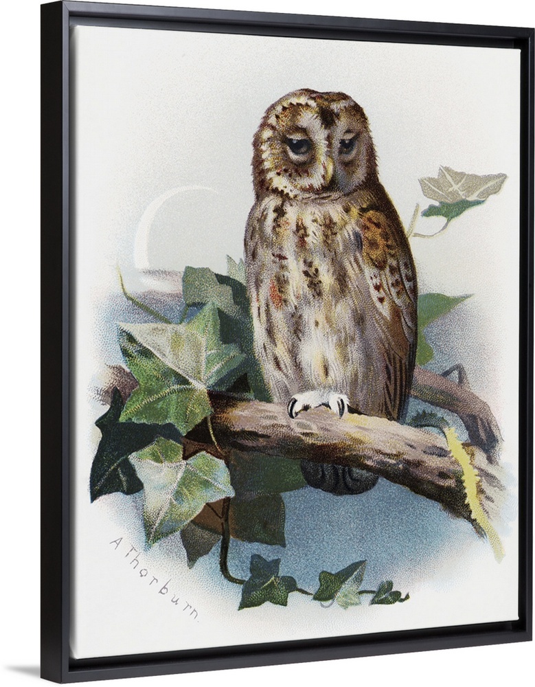 <p>Tawny owl. Historical artwork of a tawny owl (Strix aluco). This is a nocturnal predator that inhabits forests and sparse woodland across much of Eurasia. It hunts at night, and finds its prey by sound. It feeds mainly on small mammals such as mice and voles, although it also takes smaller birds, frogs, fish and insects. By day it sleeps, camouflaged against branches or in a tree hole. It may reach a length of up to 40 centimetres. It has two calls: a harsh \ke-wick\ and the \hoo-hoo\ that is often but incorrectly assumed to be produced by all owls. This artwork was drawn by Archibald Thorburn (1860-1935).</p>