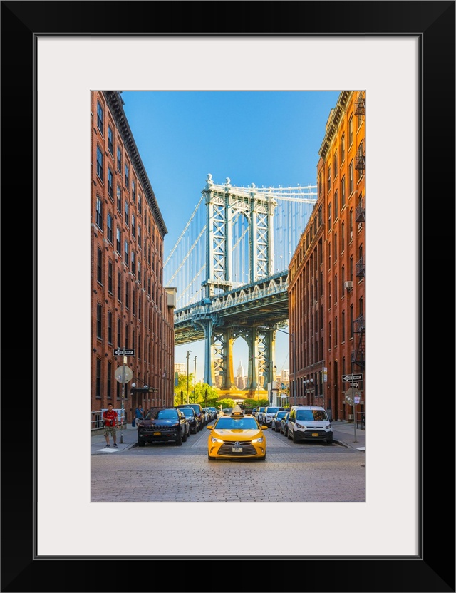 <p>Taxi passing under the Manhattan bridge with the Empire state building framed in the bridge, New York, USA.</p>