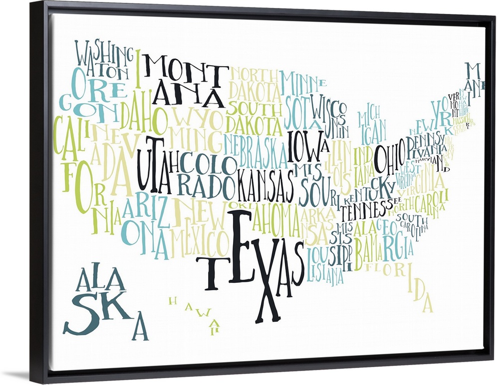 <p>A hand-drawn typography map of the United States with all the state names, in yellow, green, and blue.</p>