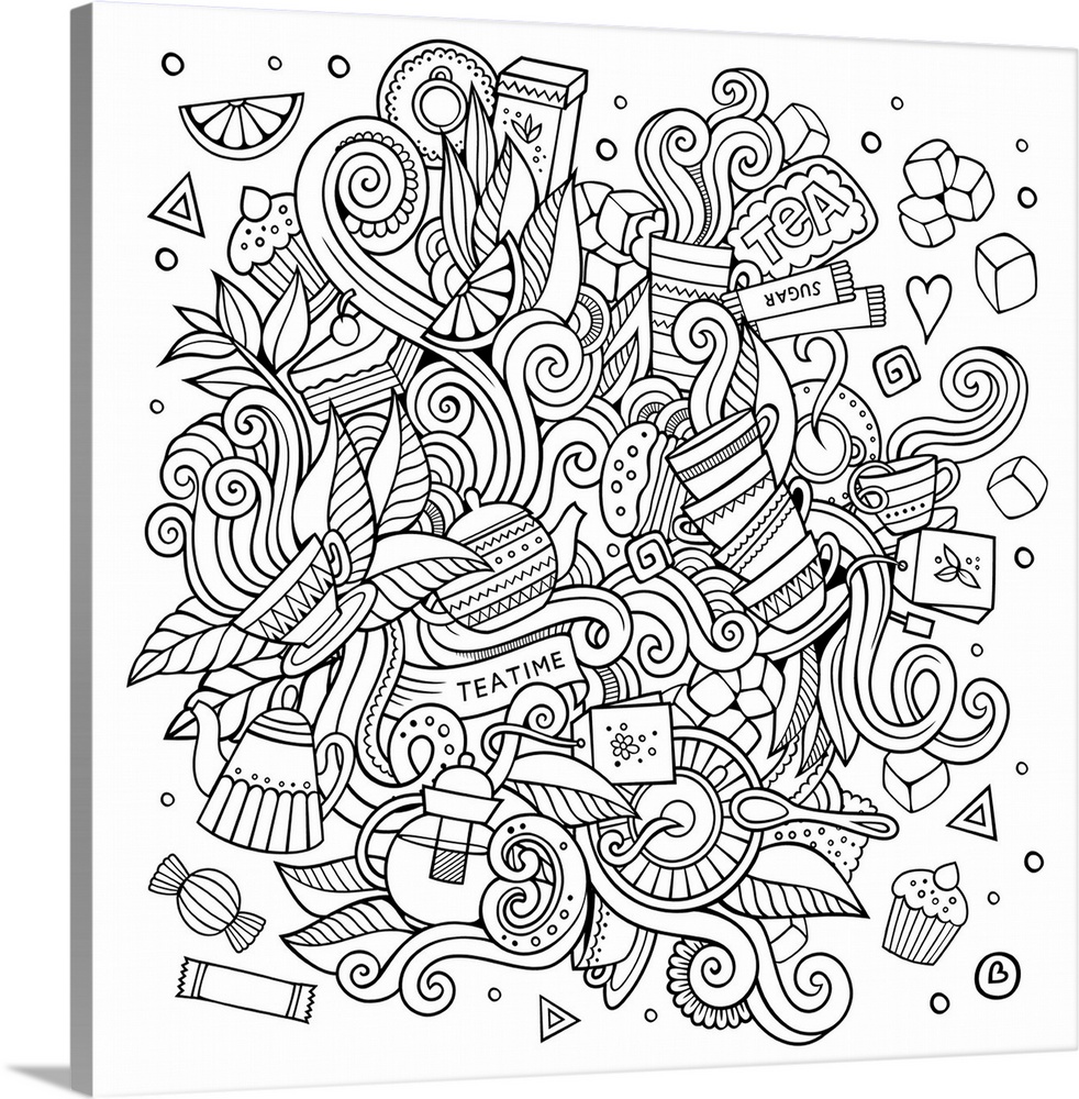 <p>Several tea cups, bags, and kettles in a design with swirls. Perfect for Coloring Canvas.</p>