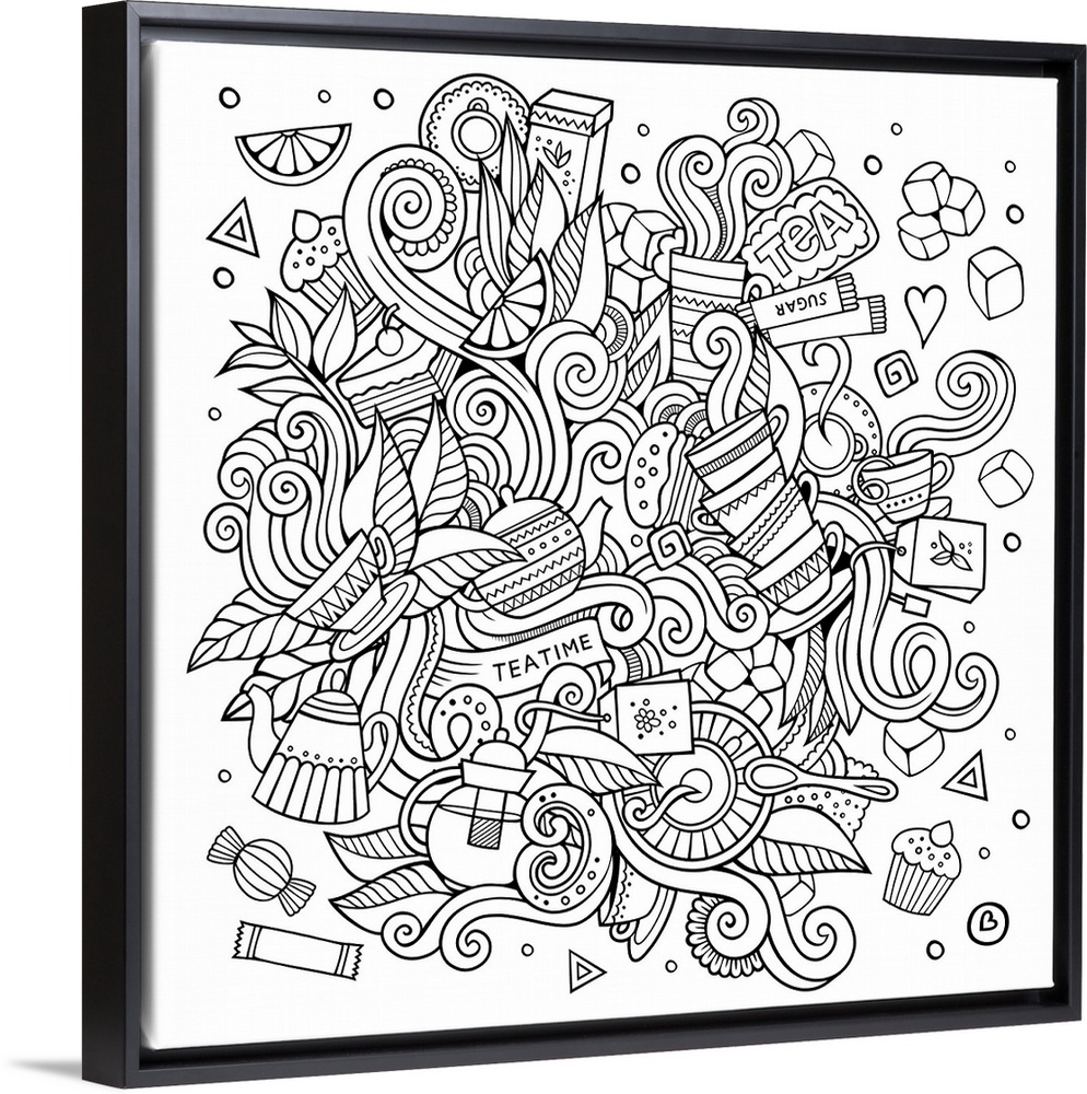 <p>Several tea cups, bags, and kettles in a design with swirls. Perfect for Coloring Canvas.</p>
