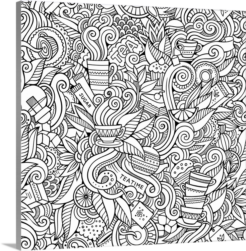 <p>Several tea cups, bags, and kettles in a design with swirls. Perfect for Coloring Canvas.</p>