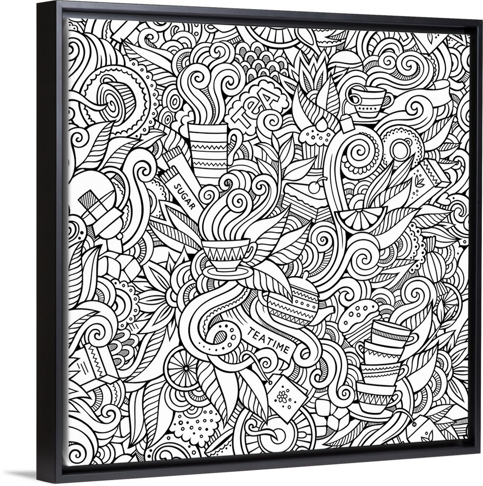 <p>Several tea cups, bags, and kettles in a design with swirls. Perfect for Coloring Canvas.</p>