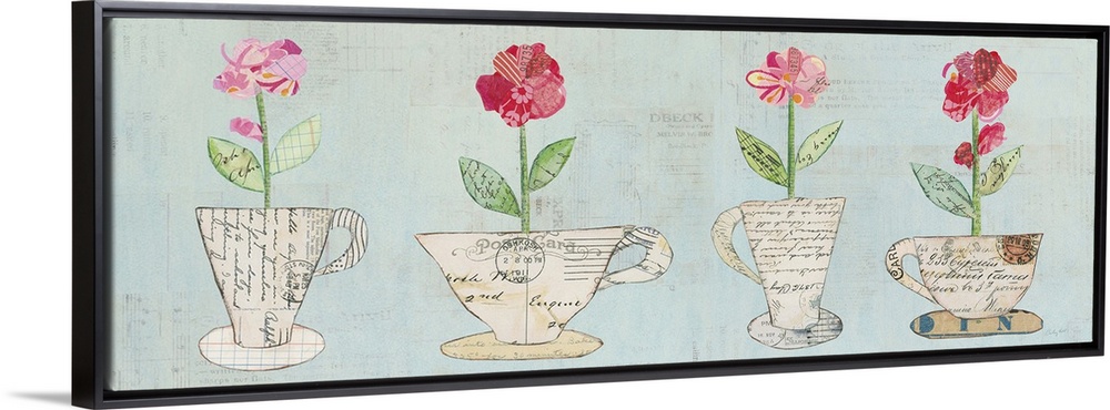 <p>Wide rectangular decorative artwork with teacups and coffee mugs that have flowers inside them created with mixed media.</p>