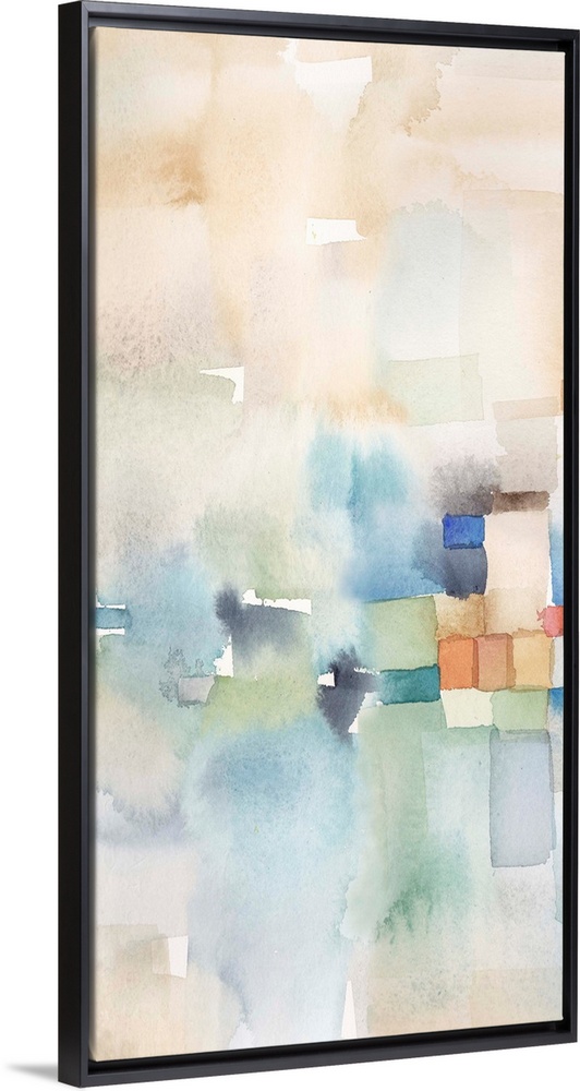 <p>Abstract watercolor painting in blurred square shapes in muted tones of orange, blue and green.</p>