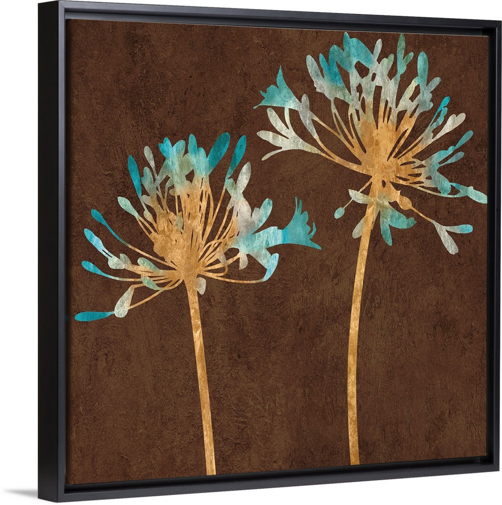 <p>Square decor with silhouettes of teal, gray, white, and gold flowers on a brown background.</p>