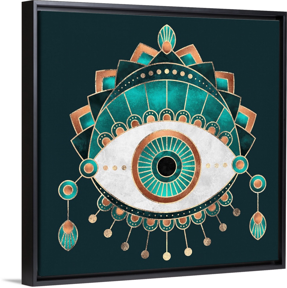 <p>Hindu-style design of an elaborately decorated eye in shades of teal and copper.</p>