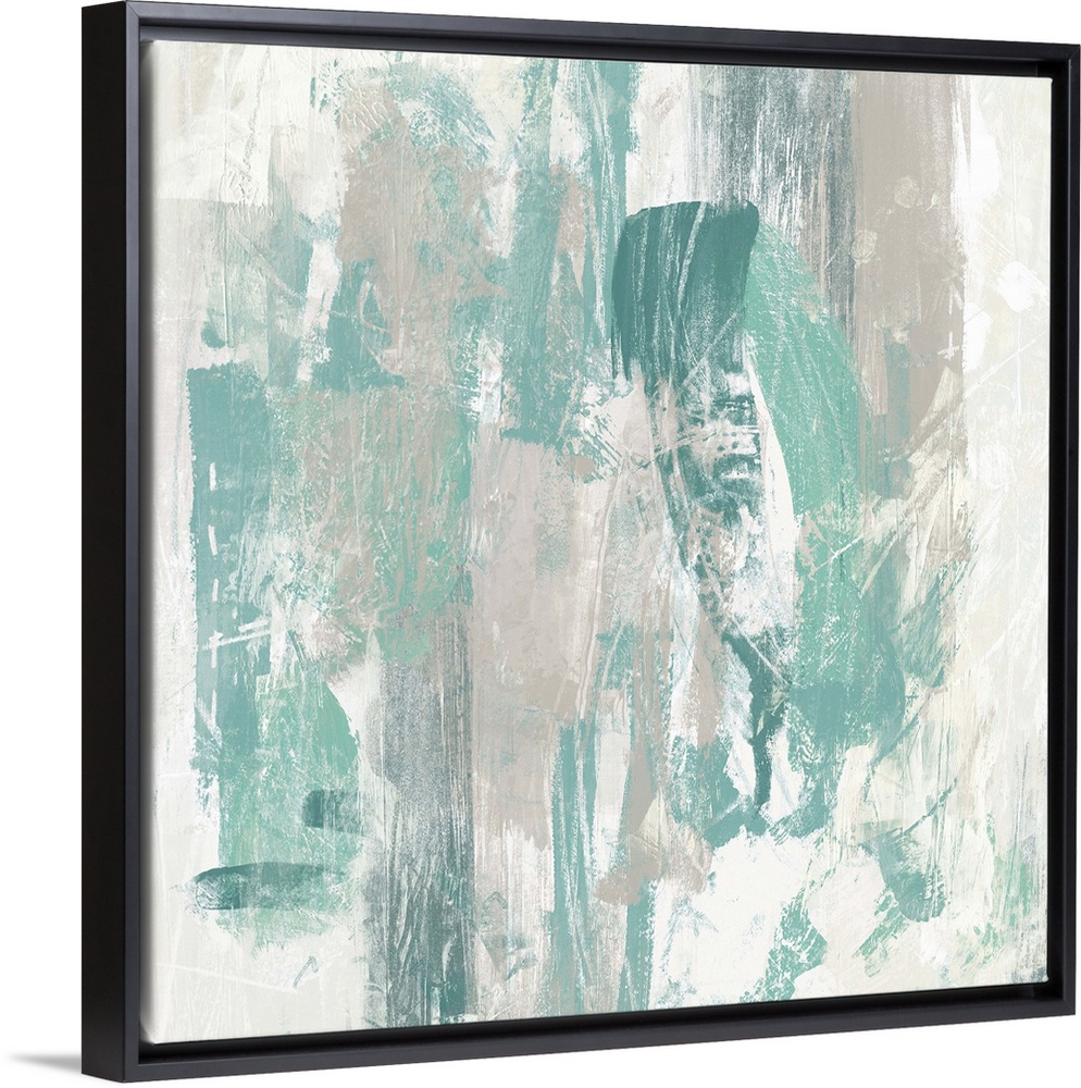 <p>Contemporary abstract painting using faded turquoise in swirling motions against a neutral background.</p>