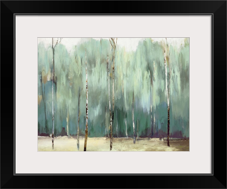 <p>Contemporary artwork of a jade forest with thin trees.</p>