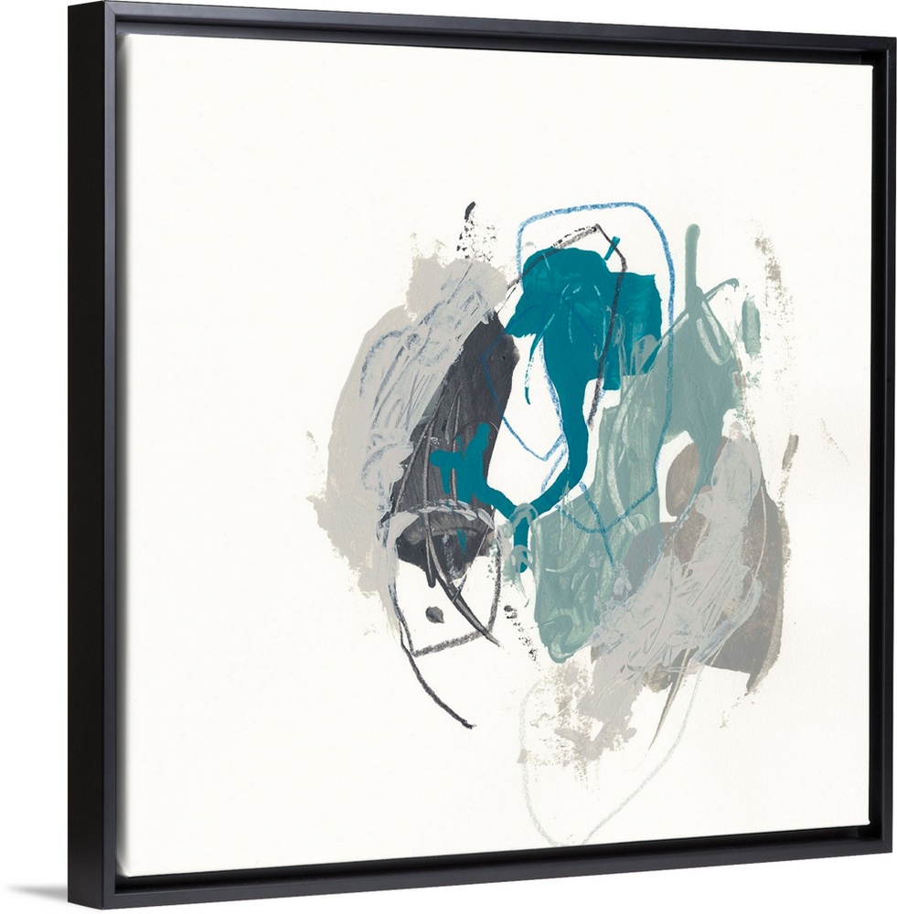 <p>Square abstract painting in cool tones of gray, teal and black with overlaying fine gray and blue lines in circular shapes.</p>
