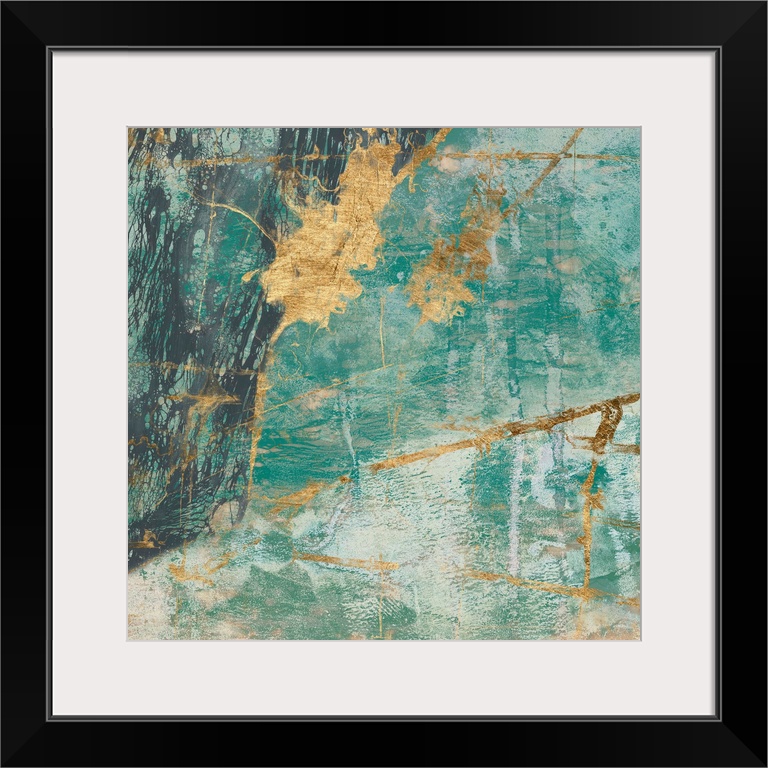 <p>Contemporary abstract painting with a weathered feel in deep teal and gold.</p>