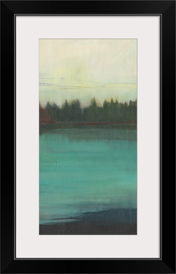 <p>Vertical painting of a deep turquoise lake with a pale sky above.</p>
