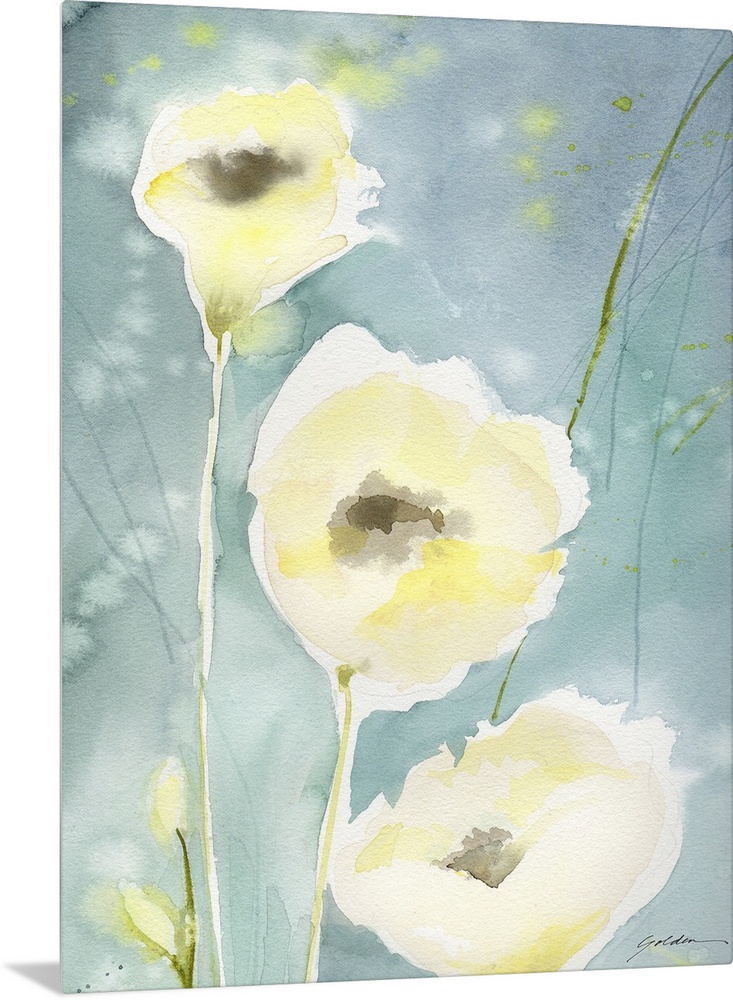 <p>A vertical watercolor painting of delicate yellow flowers against a teal backdrop.</p>