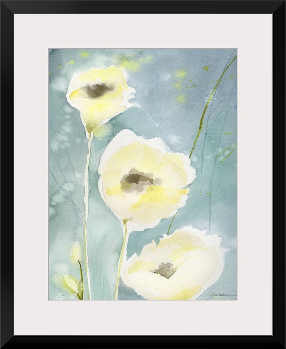 <p>A vertical watercolor painting of delicate yellow flowers against a teal backdrop.</p>