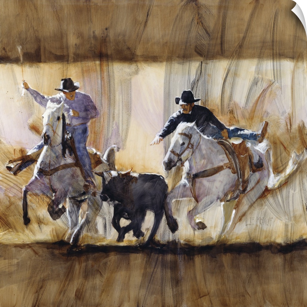 <p>Western themed contemporary painting of cowboys wrangling a calf.</p>