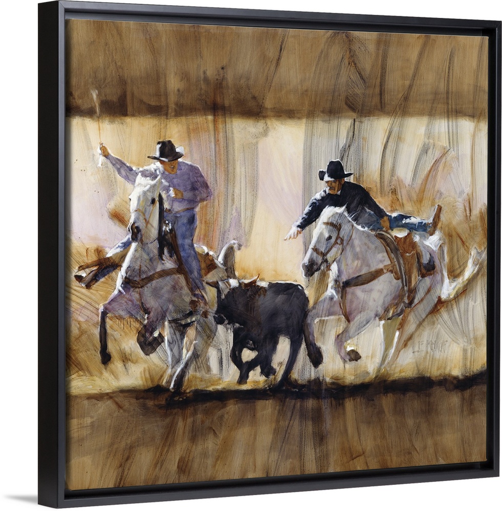 <p>Western themed contemporary painting of cowboys wrangling a calf.</p>