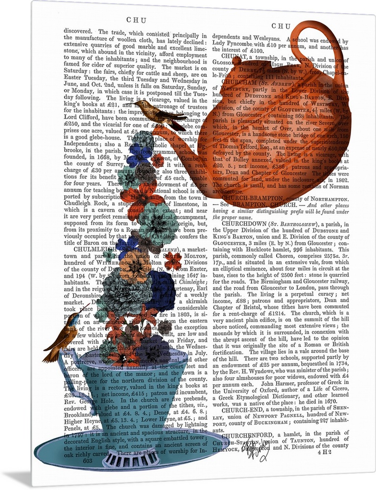<p>Decorative artwork of a teapot pouring flowers into a teacup with two birds painted on the page of a book.</p>