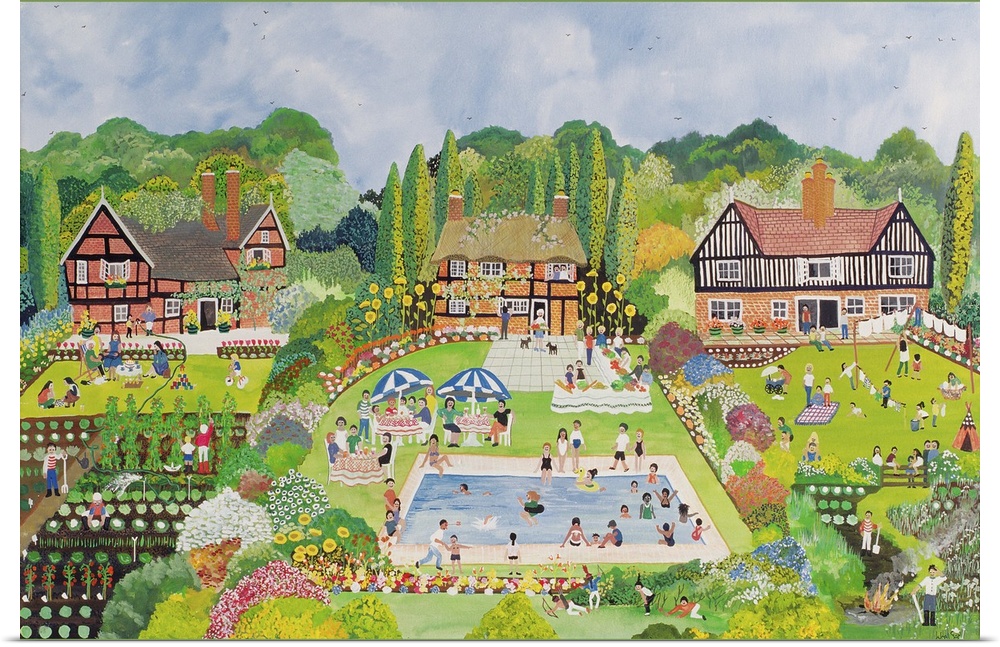 <p>Contemporary painting of a neighborhood with gardens and lots of people.</p>