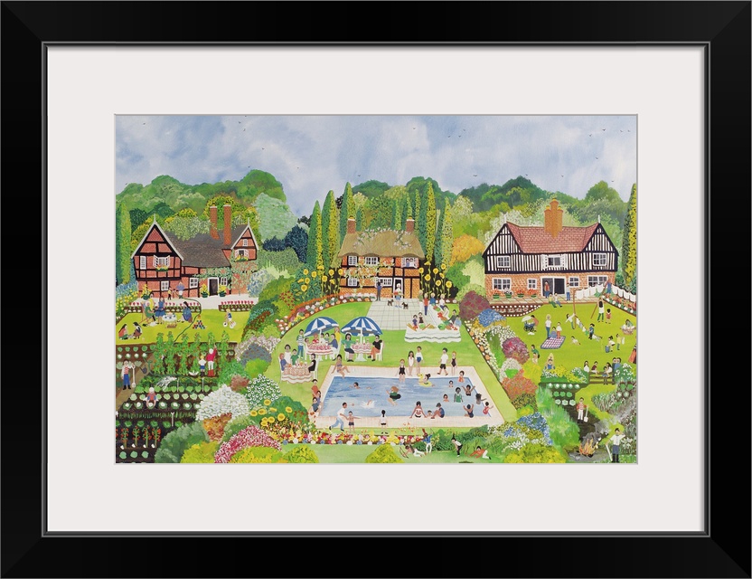 <p>Contemporary painting of a neighborhood with gardens and lots of people.</p>