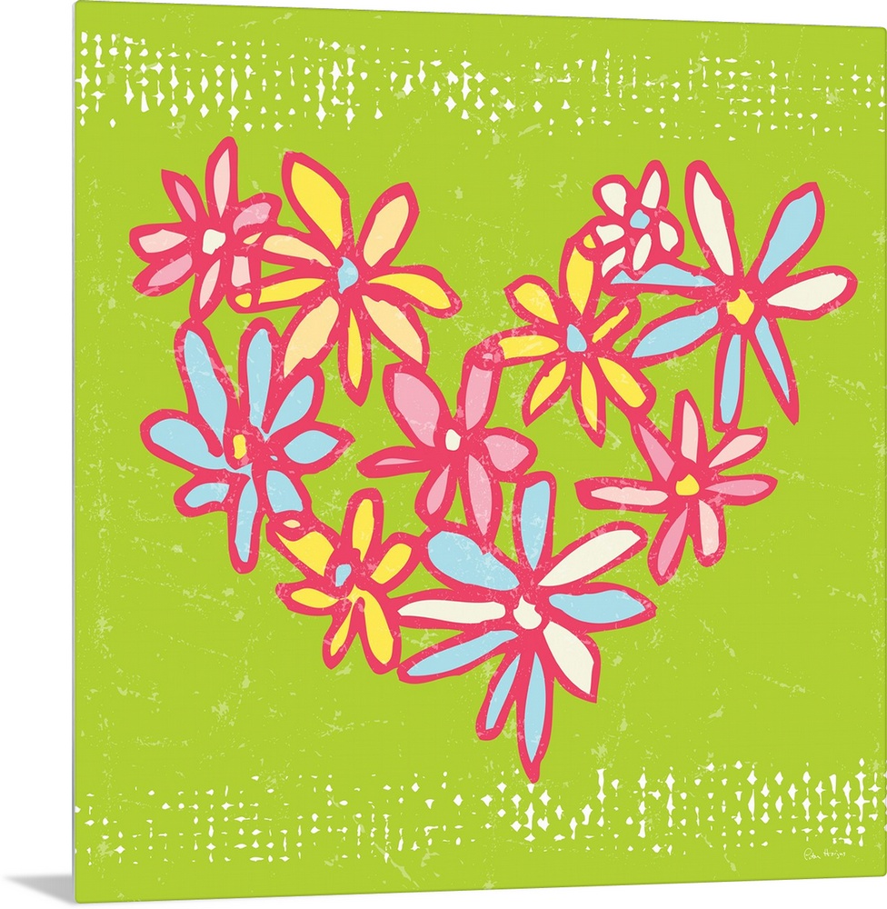 <p>A pen and ink illustrated heart made out of colored daisies on a green background.</p>