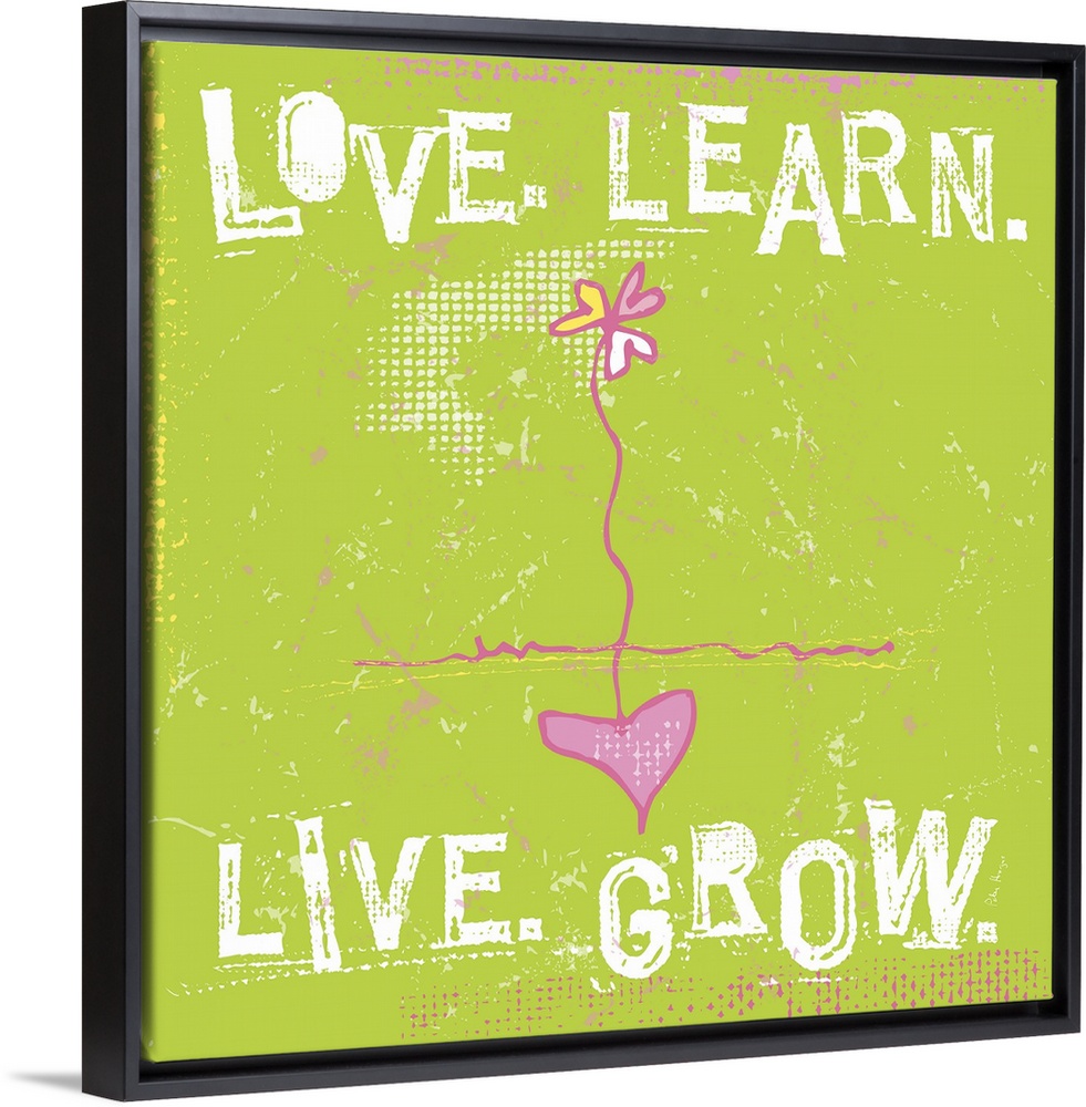 <p>Typography words Love. Learn. Live. Grow. arranged around a daisy with a heart as the root.</p>