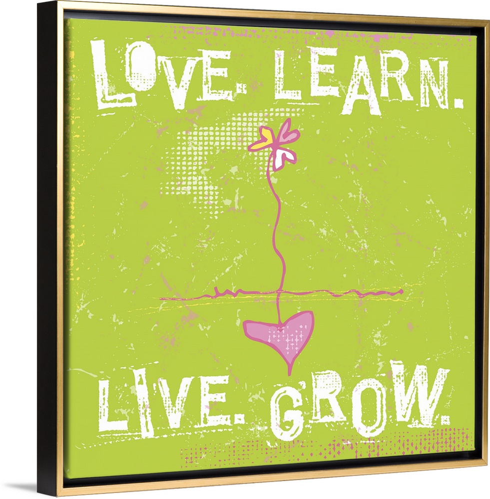 <p>Typography words Love. Learn. Live. Grow. arranged around a daisy with a heart as the root.</p>