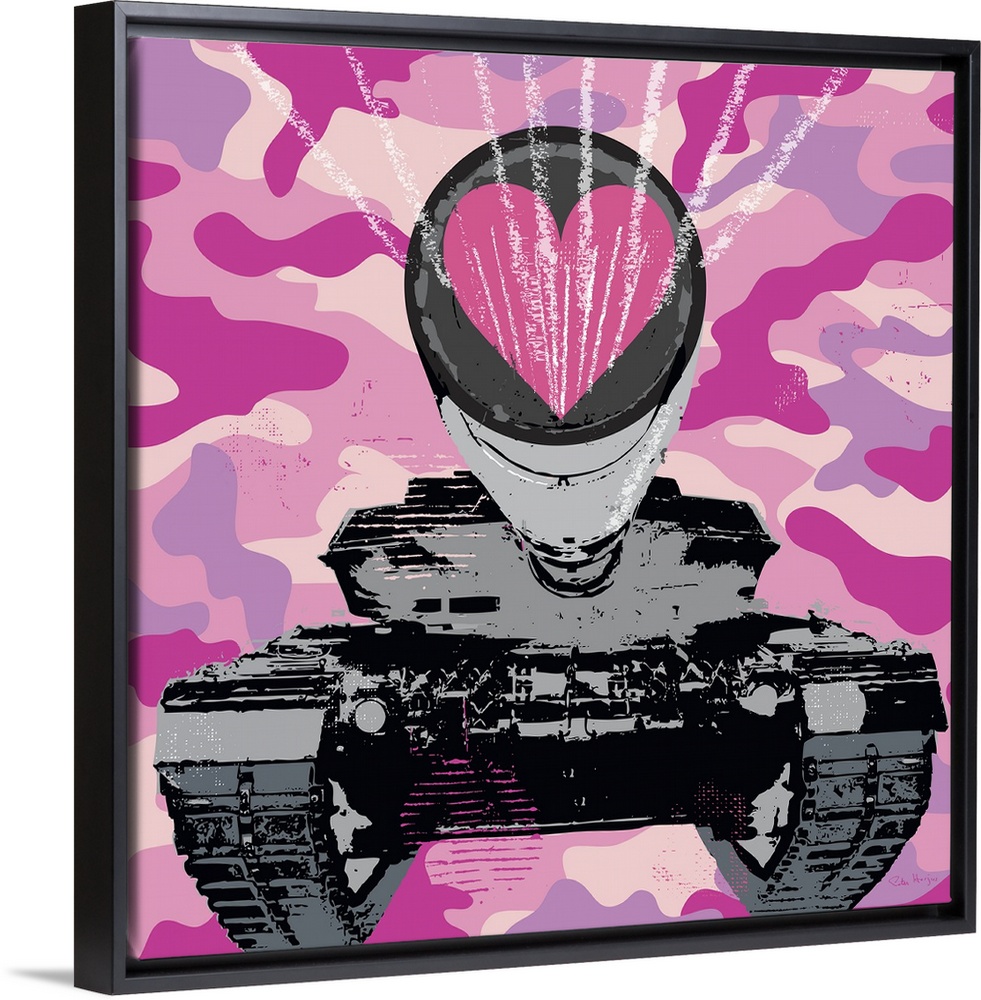<p>Graphic art of a military tank shooting out a love heart with a pink camoflauge background.</p>