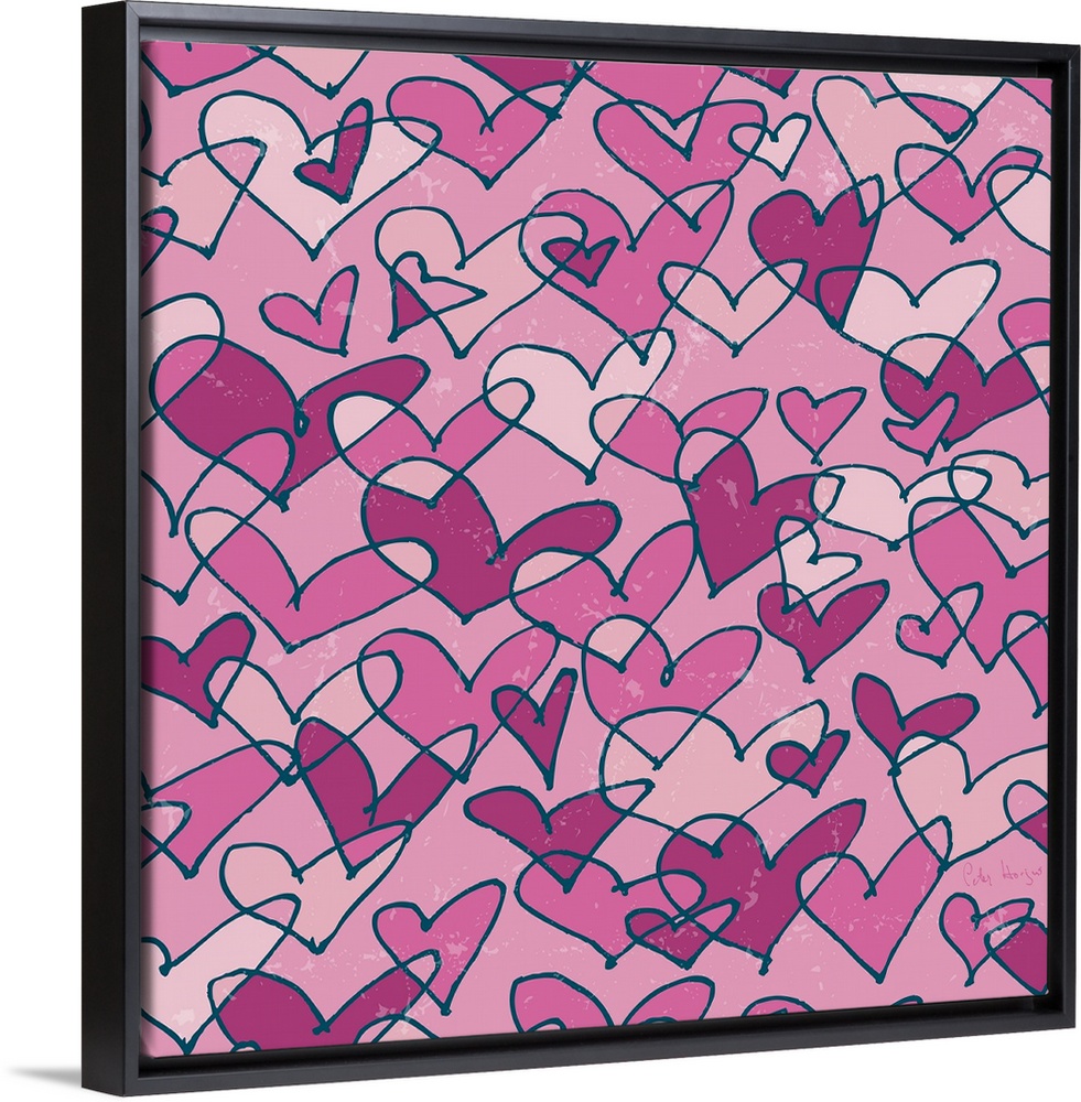 <p>A pattern of pen and ink illustrated pink hearts on a pink background.</p>
