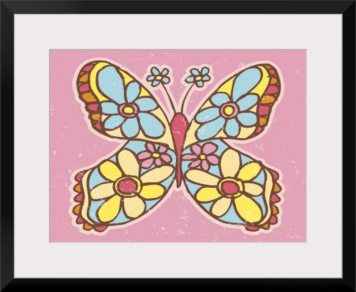 <p>A pen and ink illustrated butterfly with flowers on a pink background.</p>
