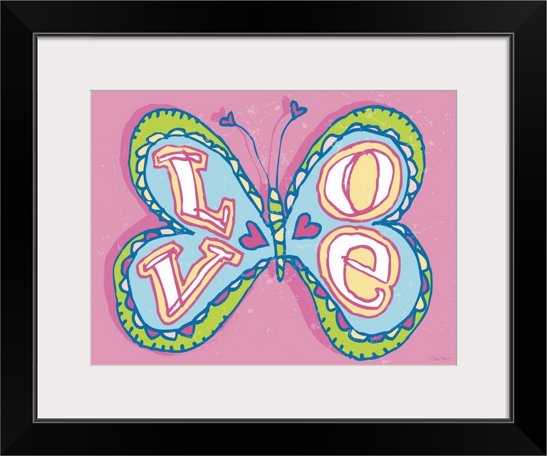 <p>A pen and ink illustrated butterfly with the word "LOVE" handwritten in the wings.</p>