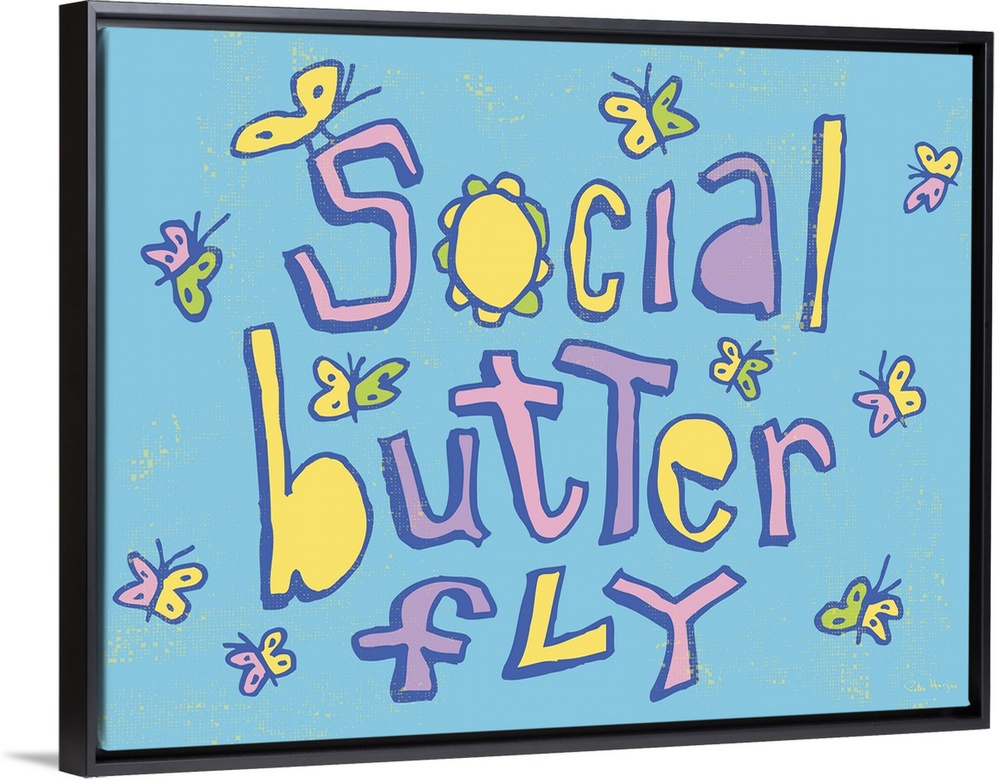 <p>Pen and Ink illustration artwork of small butterflies hovering all over the phrase "Social Butterfly"</p>