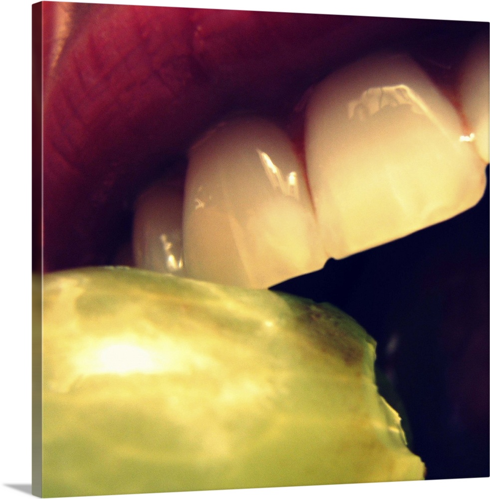 <p>Partial mouth and teeth biting green grape.</p>