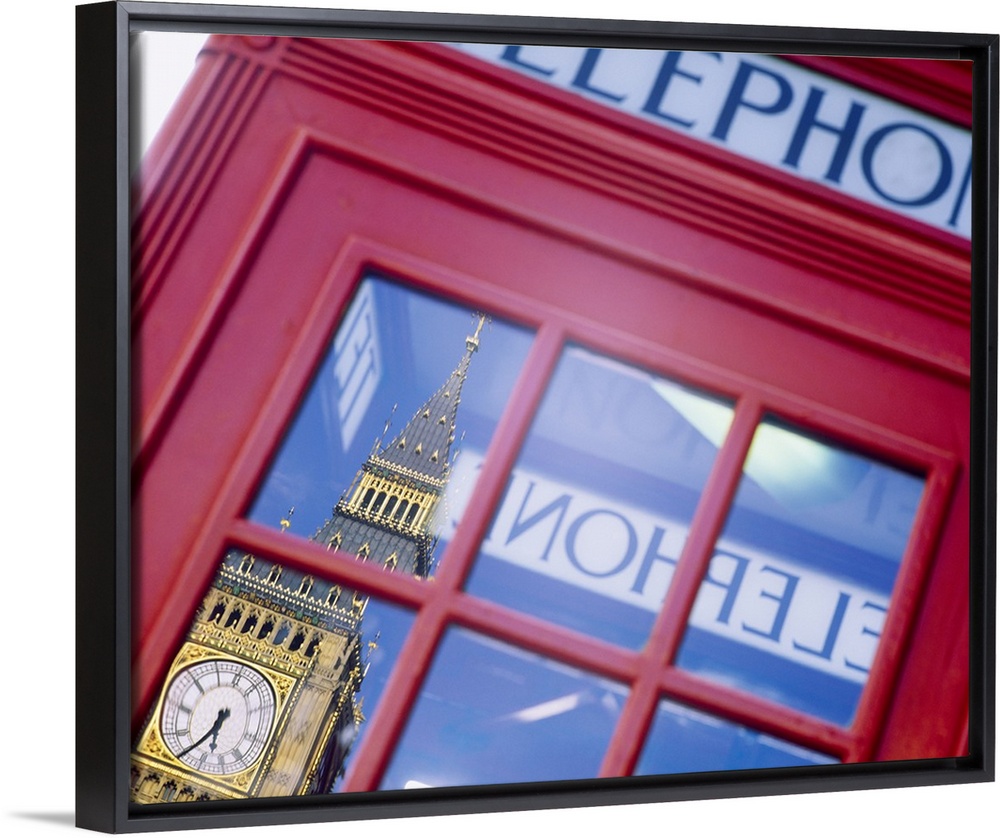 <p>Upclose photograph of a British telephone booth in London showing the reflection of Big Ben at the north end of the Palace of Westminster in London, England.</p>