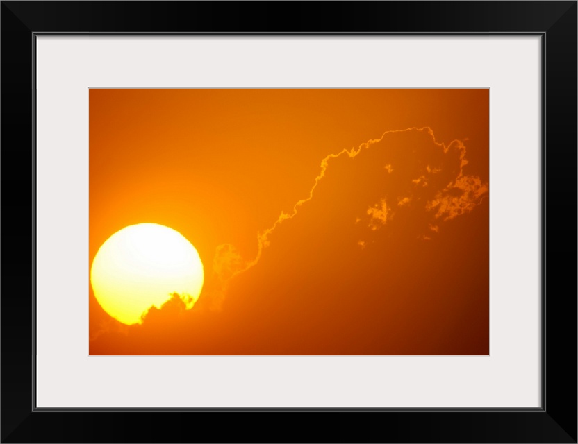 <p>Telephoto view of the rising sun behind orange clouds, Durban, Kwazulu-Natal, South Africa</p>