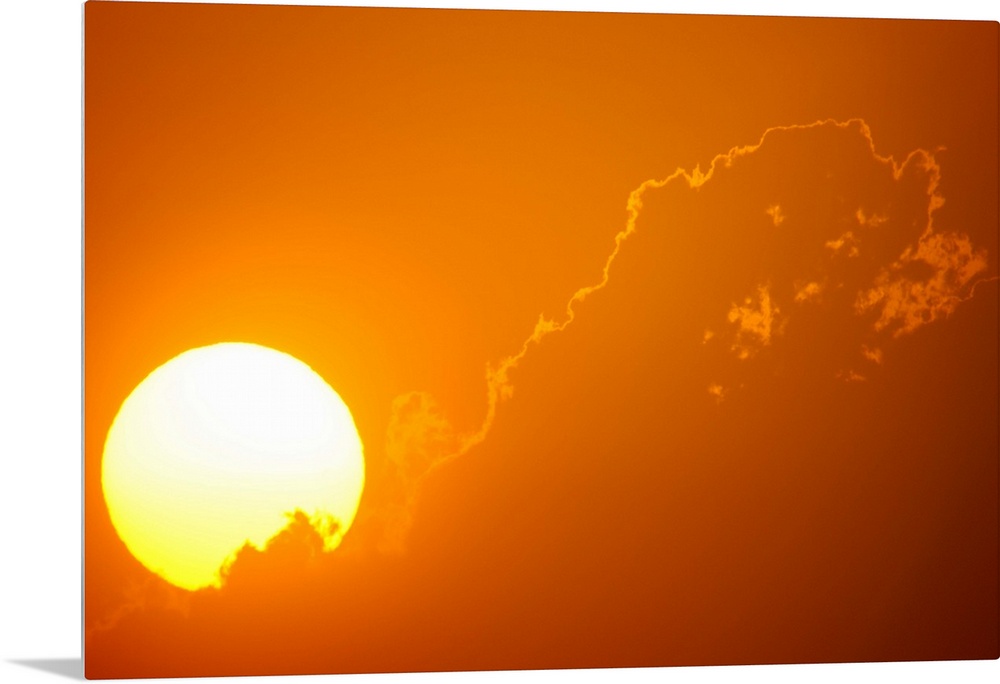 <p>Telephoto view of the rising sun behind orange clouds, Durban, Kwazulu-Natal, South Africa</p>