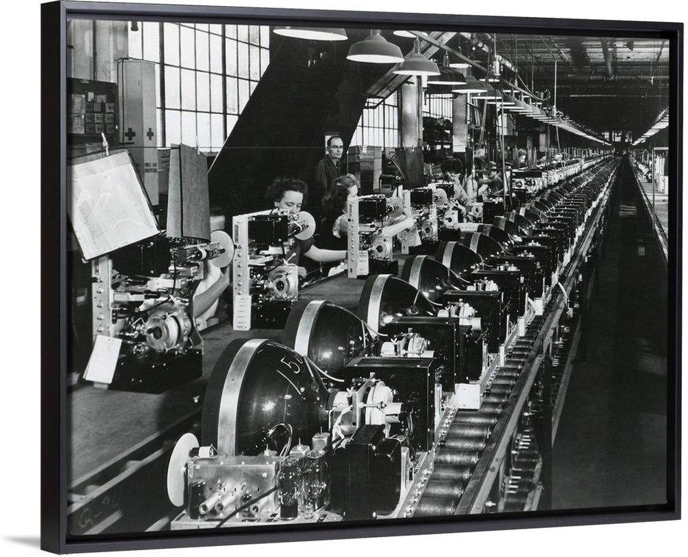 <p>Television chassis on an assembly line with women workers in a U.S. factory. July 1949.</p>