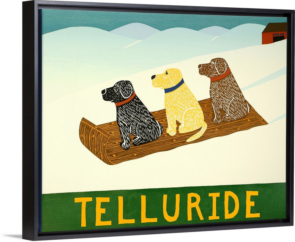 <p>Illustration of a chocolate, yellow, and black lab sledding down the slopes with "Telluride" written on the bottom.</p>