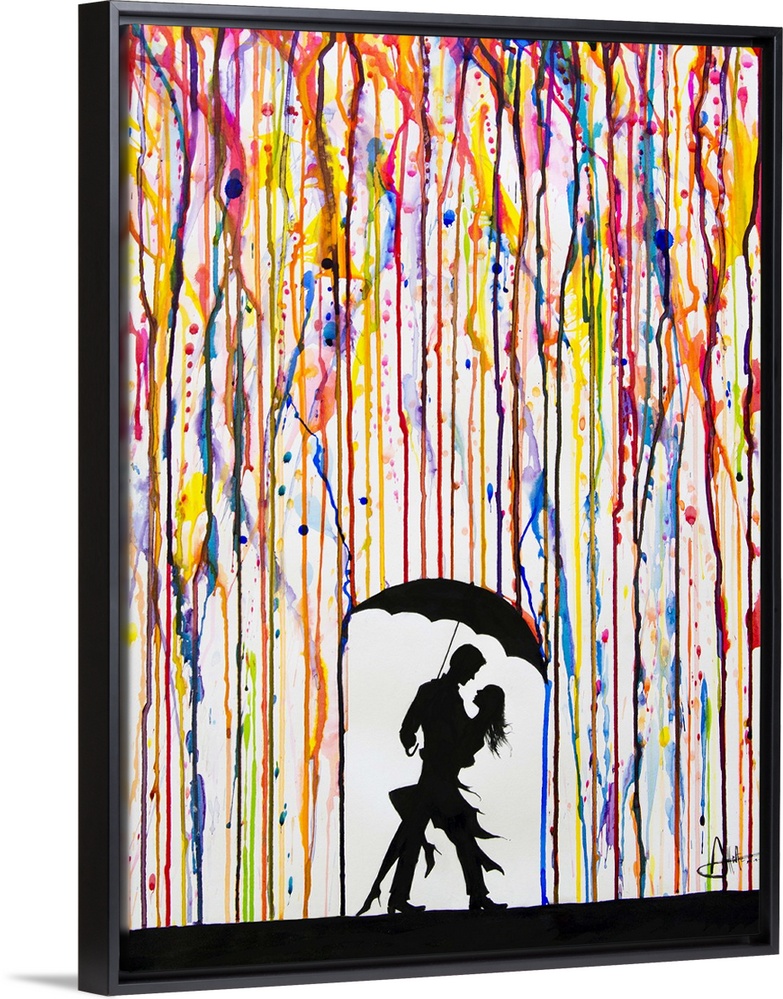 <p>Watercolor and ink painting of a couple dancing under an umbrella under colorful rain.</p>