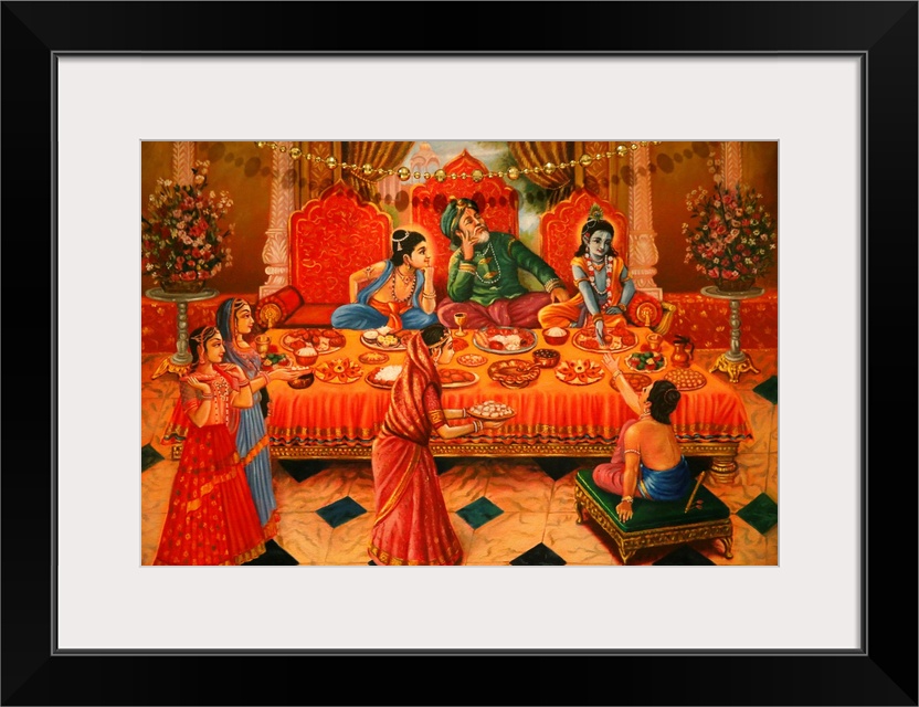 <p>Painting in the London ISKCON Hindu temple of Krishna with his brother Balaram and father Nanda Maharaj, London, England, United Kingdom, Europe.</p>