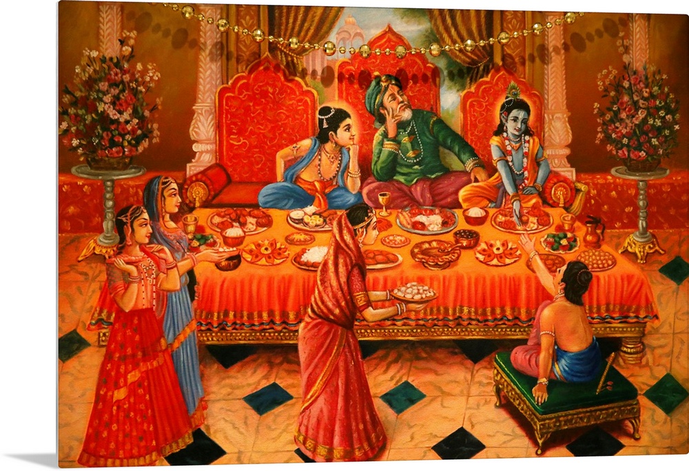 <p>Painting in the London ISKCON Hindu temple of Krishna with his brother Balaram and father Nanda Maharaj, London, England, United Kingdom, Europe.</p>