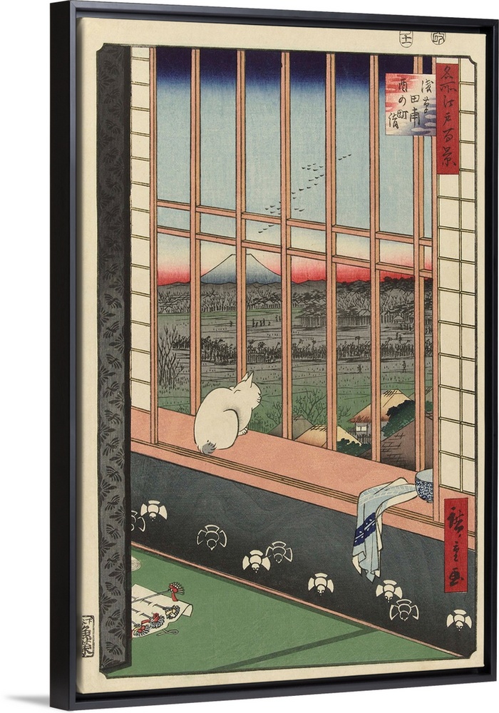 <p>Temple procession to Torinomachi in the Rice Fields of Asakusa, by Hiroshige 1st and Utagawa, 1857, Japanese woodcut. A white cat looking outdoors from the window, with Mount Fuji in the distance.</p>